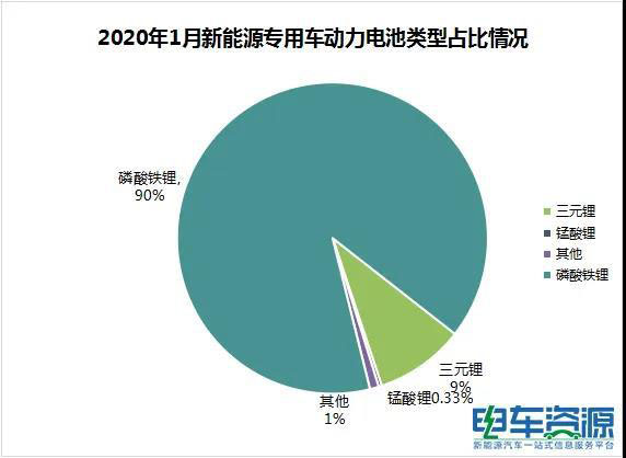 從動(dòng)力電池的技術(shù)路線來(lái)看,在2020年1月新能源專(zhuān)用車(chē)165.82MWh電池裝機(jī)總量中,磷酸鐵鋰占據(jù)絕對(duì)的主導(dǎo)地位,裝機(jī)量為148.29MWh,占比89.43%;三元鋰電池裝機(jī)量為15.45MWh,占比9.32%;錳酸鋰電池裝機(jī)量為0.55MWh,占比0.33%;其他未知名類(lèi)型鋰電池1.53MWh,占比0.92%。