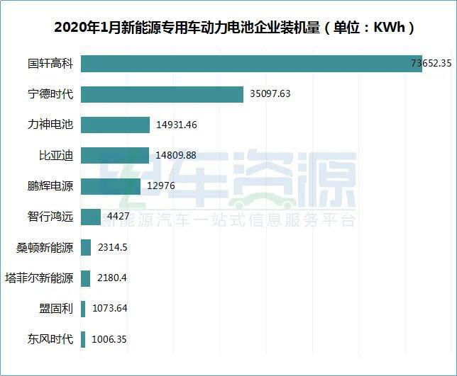 從電池廠商看,2020年1月為新能源專(zhuān)用車(chē)提供電池配套的企業(yè)共27家。其中,國(guó)軒高科以73.65MWh的裝機(jī)量獲得冠軍的寶座,遙遙領(lǐng)先于其他企業(yè);寧德時(shí)代以35.1MWh位居第二,電池裝機(jī)量?jī)H占國(guó)軒高科電池裝機(jī)量的一半;排名第三的是力神電池,裝機(jī)量為14.9MWh;比亞迪以14.8MWh的裝機(jī)量緊隨其后,排名第四;鵬輝電源首次擠進(jìn)前5名,裝機(jī)量為12.98MWh;縱觀近半年的電池裝機(jī)量TOP10,從3-10的排名變動(dòng)極大,呈現(xiàn)出一種異常激烈的競(jìng)爭(zhēng)局面。