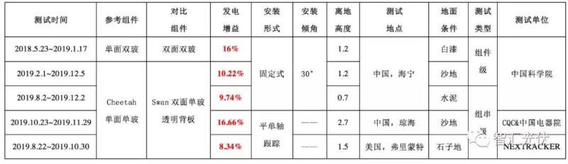 綜上所述,以上3個實證項目展現(xiàn)了不同地面類型、不同支架系統(tǒng)和不同氣候環(huán)境,在試驗期內(nèi),晶科Swan雙面組件能提高發(fā)電量8.34%~16.66%之間,如下表所示。