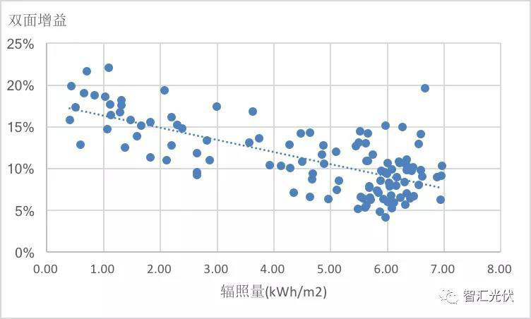 雙面組件背面的增益受輻射量情況影響很大。根據(jù)上圖中海寧的日數(shù)據(jù)統(tǒng)計,在輻射強度較低、太陽能資源較差的時候,背面的增益更加明顯。