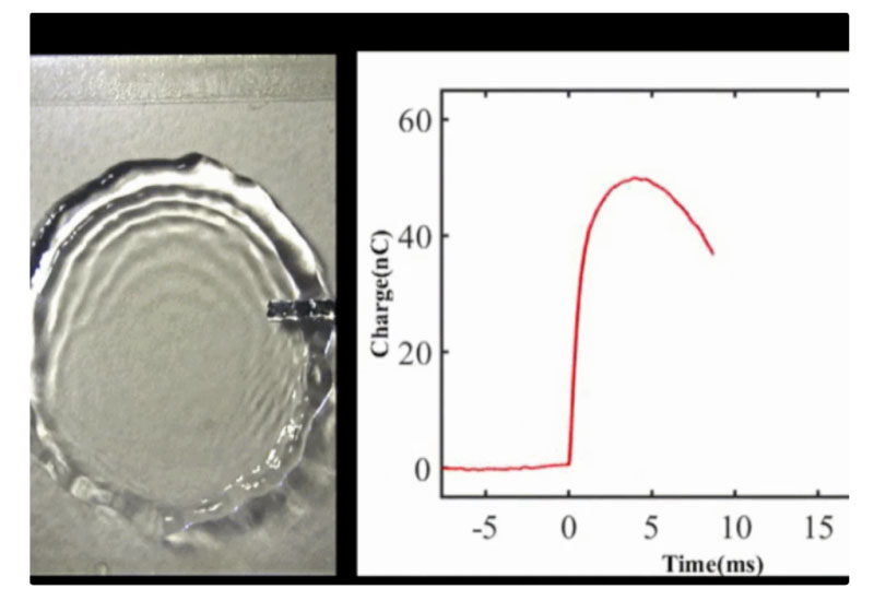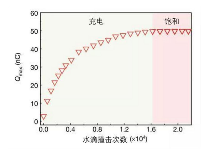 他們發(fā)現(xiàn),經(jīng)過自來水液滴持續(xù)的撞擊,表面效應(yīng)就會變成體效應(yīng):聚四氟乙烯的表面將累積起很高的電荷密度,這個電荷密度會在 16000 次撞擊之后達(dá)到最高值。也就是說,他們把一種日常生活中常見的材料,變成了類似電容一樣的儲存大量電荷的容器。