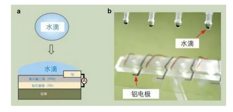 但隨著 “砸” 在表面上的水滴鋪展開來,“奇跡”就出現(xiàn)了。隨著水滴的表面積越變越大,它逐漸擴散到了鋁電極上。由于水滴也是導(dǎo)電的,它就在一個瞬間接通了之前本不相連的聚四氟乙烯、鋁電極和氧化銦錫電極,形成了一個連通的電路。在這個過程中,這水滴不只是發(fā)電系統(tǒng)的能量來源,更重要的是整個發(fā)電機的開關(guān)。