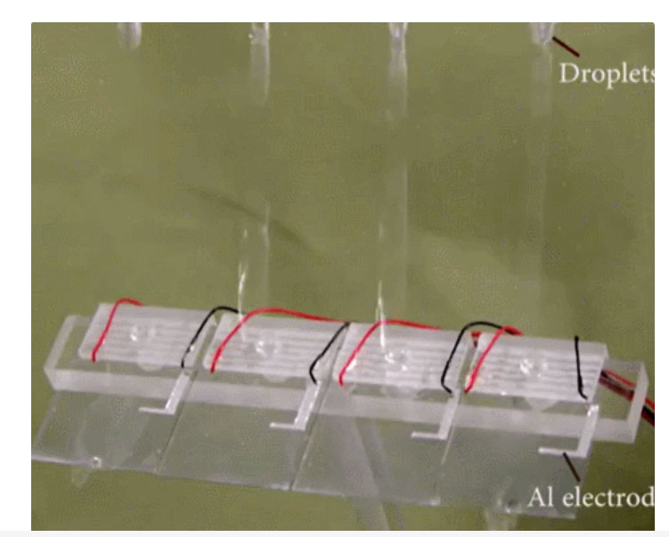 在聚四氟乙烯和氧化銦錫電極之外,他們還安裝了一個鋁電極。這樣一來,這個發(fā)電機就像半導(dǎo)體中的三極管一樣,擁有了三個電極。這第三個電極成為了提高水滴發(fā)電機功率的關(guān)鍵。