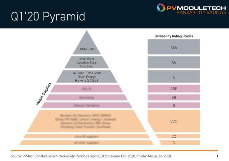 在最新發(fā)布2020年Q1 PV ModuleTech可融資性評(píng)級(jí)報(bào)告中,隆基成為首個(gè)也是唯一一個(gè)獲得AAA評(píng)級(jí)的組件供應(yīng)企業(yè),創(chuàng)下目前該評(píng)級(jí)報(bào)告中所統(tǒng)計(jì)最高水平,也同時(shí)是全球光伏組件供應(yīng)商可達(dá)到的最高級(jí)別。