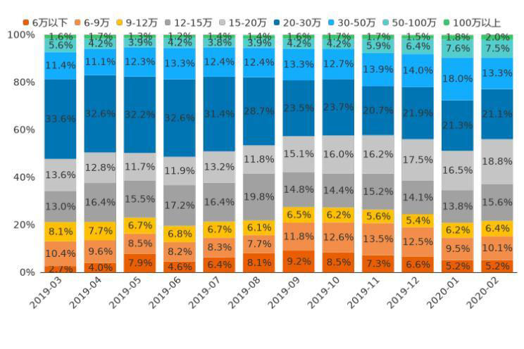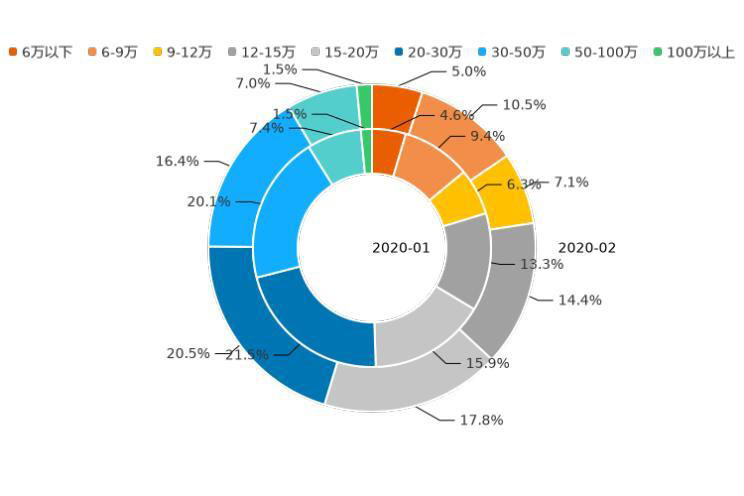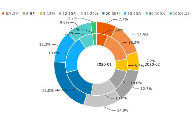 通過分析近12個(gè)月的用戶意向數(shù)據(jù)發(fā)現(xiàn),2019年3月至今年2月,12萬以下價(jià)區(qū)用戶意向占比增加0.5個(gè)百分點(diǎn),低價(jià)市場熱度有所升溫;12-20萬價(jià)區(qū)用戶意向占比上漲7.8%,市場熱度保持大幅增長;20萬以上價(jià)區(qū)用戶意向占比,下跌8.3個(gè)百分點(diǎn),其中,20-30萬價(jià)區(qū)市場熱度下滑明顯,近12個(gè)月線索占比下跌12.5%。未來,隨著新能源車型的布局更全面,市場將進(jìn)一步細(xì)分,價(jià)區(qū)覆蓋也會更加均勻。