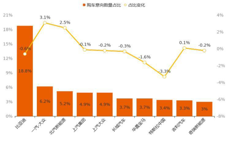 在日趨激烈的市場競爭中,各車企對于用戶的爭奪也是愈演愈烈。縱觀2月市場,TOP 10廠商用戶購車意向占比累計(jì)達(dá)57.1%,相較上月份額下滑0.6個(gè)百分點(diǎn),市場集中度有所下降。十個(gè)廠商中,有3個(gè)廠商用戶意向占比實(shí)現(xiàn)上漲,份額增幅最大的廠商為一汽-大眾,以3.1%的增幅領(lǐng)漲TOP 10廠商;跌幅最大的廠商為特斯拉中國,下降比例為3.3%。一汽-大眾回歸第二的位置,特斯拉則從第二降至第八。