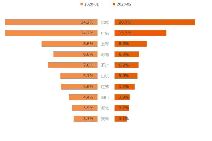 上述10個(gè)省份中,用戶意向占比有所增長的僅有2個(gè),另外8個(gè)省份的意向占比出現(xiàn)不同程度下滑。其中,北京用戶意向增加6.5%,為意向占比增長較高的省份,山東增長0.2%;浙江減少1.4%,為下降最多省份。