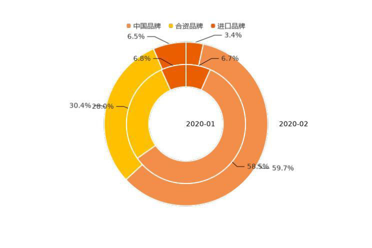 2月,中國品牌用戶購車意向占比相較上月,增加1.1個(gè)百分點(diǎn),達(dá)到59.7%,用戶熱度有所升溫。合資品牌用戶意向占比為30.4%,相對上月意向份額上升2.4%。進(jìn)口品牌份額從6.8%下降至6.5%。在華獨(dú)資車企(目前僅特斯拉)用戶購車意向從6.7%降至3.4%。