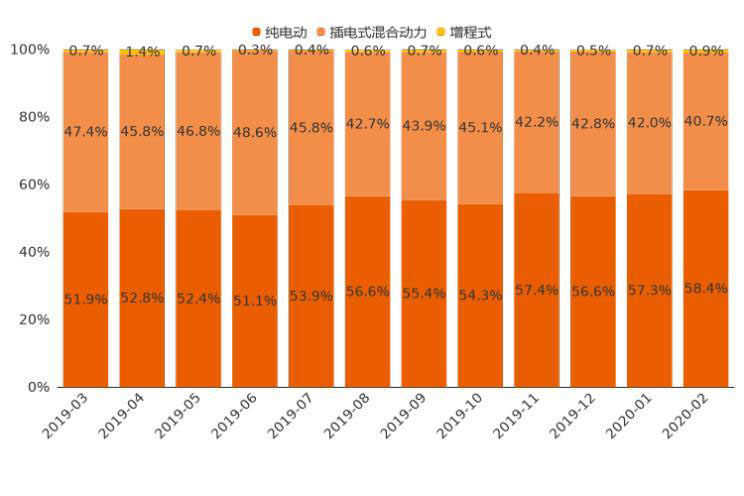 今年2月,新能源車中純電動車型用戶購車意向占比為58.4%,相較上月小幅上漲1.1個(gè)百分點(diǎn),購車意向占比持續(xù)提升;插電式混合動力車型購車意向占比為40.7%,與上月相比小幅下跌1.3個(gè)百分點(diǎn),購車意向占比持續(xù)下滑;增程式車型用戶意向占比僅為0.9%。整體來看,較長時(shí)間里,純電動車用戶意向長期高于50%的位置,且最近幾月呈上升態(tài)勢。這一定程度上反映了,經(jīng)過一段時(shí)間的引導(dǎo),用戶對純電動車的認(rèn)知度和接受度在提高。