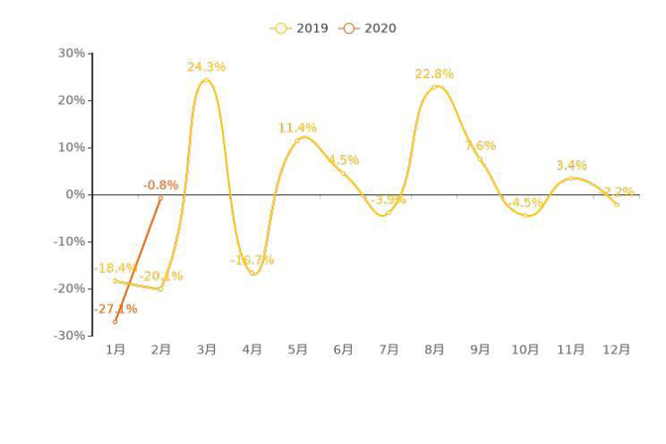 首先,我們來看一下新能源汽車的整體走勢如何。2020年2月,新能源車用戶購車意向數(shù)量環(huán)比下降0.8%,但相較上月環(huán)比27.1%的降幅,已經(jīng)有所收窄。汽車市場具有明顯的季節(jié)性和周期性,我們將今年的用戶購車意向數(shù)據(jù)與上一年的數(shù)據(jù)對比來看,今年2月與上一年同期相比,市場熱度降幅有所收窄,主要原因?yàn)槿ツ晖谟脩粢庀颦h(huán)比數(shù)據(jù)波動幅度較大,今年的市場波動相對更加緩和。整體來看,市場熱度有反彈趨勢。