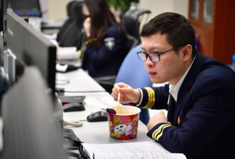 2月6日,調(diào)度大廳內(nèi),調(diào)度長崔偉在吃飯間隙查看工作數(shù)據(jù)。