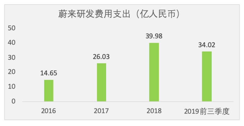 2018年,蔚來整體研發(fā)投入為39.979億元人民幣,比2017年增長(zhǎng)53.6%。2019年前三季度研發(fā)費(fèi)用支出34.02億元,在艱難的第三季度,蔚來在研發(fā)方面的投入依然達(dá)到了10.232億元。