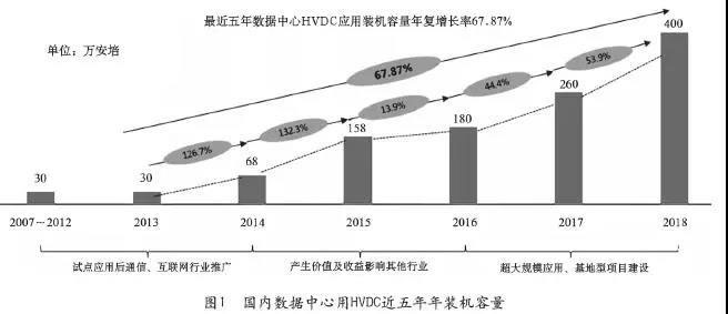 首先,第一個金指標是用量增長,也是判斷HVDC在數(shù)據(jù)中心應用優(yōu)勢的充分條件。通過圖1可以看出:數(shù)據(jù)中心HVDC從2013年裝機容量約30萬安培,到2018年新裝機400萬安培,五年時間年增長率為1233.3%,年復增長率67.87%;如果按2A帶一臺IT主設備,則最近一年裝機容量可以承擔約200萬臺IT設備的電力容量。
