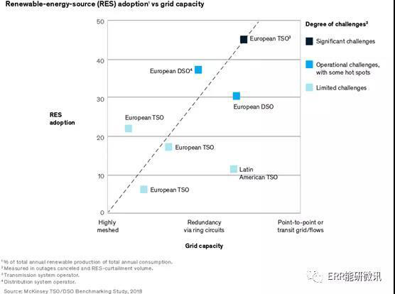 今天很多輸配電網(wǎng)運營商都面臨這種挑戰(zhàn)。在最近的一次全球電網(wǎng)運營商的標(biāo)準(zhǔn)討論中,百分之七十的應(yīng)答者表示他們希望增加相關(guān)規(guī)定,比如短期內(nèi)頻繁取消停運以及停運可再生發(fā)電設(shè)施。這些運營商面臨的困難程度和他們所處市場中的可再生能源滲透率以及電網(wǎng)容量緊密相關(guān)(圖1)。耦合性高的電網(wǎng)通??梢韵{更多的不可預(yù)知的可再生能源的接入;反之電網(wǎng)冗余度有限的地方,運營者面臨消納水平更低的挑戰(zhàn)。一些輸配電網(wǎng)運營商正在處在后者的困境中。