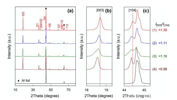 這種層狀結(jié)構(gòu)向尖晶石和巖鹽結(jié)構(gòu)轉(zhuǎn)變可以通過(guò)XRD進(jìn)行分析,下圖對(duì)比了新鮮正極(1)、3.0-4.5V,0.5C循環(huán)200次(2)、4.5V浮充200h(3)和4.7V浮充200h(4)后的NCM811材料的XRD圖譜,從下圖a中能夠看到所有樣品都保持了層狀結(jié)構(gòu),但是當(dāng)我們仔細(xì)對(duì)比(003)和(004)特征峰就能夠發(fā)現(xiàn)這兩個(gè)特征峰在經(jīng)過(guò)循環(huán)和浮充后都向小角度發(fā)生了偏移,表明晶格結(jié)構(gòu)的變化,我們對(duì)比I(003)/I(004)可以發(fā)現(xiàn),四個(gè)樣品的值分別為1.39、1.11、1.16和0.98,表明在循環(huán)和浮充后材料都有不同程度的過(guò)渡金屬元素與Li的混排現(xiàn)象的發(fā)生,導(dǎo)致材料從層狀結(jié)構(gòu)向尖晶石結(jié)構(gòu)和巖鹽結(jié)構(gòu)轉(zhuǎn)變。