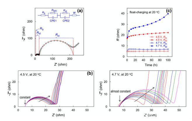 作者還采用交流阻抗設(shè)備分析了浮充對(duì)于材料的性能的影響,下圖b為分別在4.5V和4.7V下浮充不同時(shí)間的NCM811材料的交流阻抗圖譜,根據(jù)圖a所示的等效電路進(jìn)行擬合,歐姆阻抗Rb和界面膜阻抗Rsl隨浮充時(shí)間的變化如下圖c所示,從圖中能夠看到Rb在整個(gè)浮充的過(guò)程中基本保持不變,只有4.7V浮充的過(guò)程中在前5個(gè)小時(shí)出現(xiàn)了輕微的增加,而界面膜阻抗的Rsl則一直隨著浮充時(shí)間的增加而緩慢增加,而4.7V浮充的電池則在開(kāi)始的時(shí)候出現(xiàn)了明顯的增加,這表明4.7V電壓下進(jìn)行浮充時(shí)NCM811材料釋放晶格氧氧化電解液,以及由此導(dǎo)致的界面膜阻抗增加主要發(fā)生在前5個(gè)小時(shí),隨后界面膜阻抗的增加則主要來(lái)自NCM811材料表面從層狀結(jié)構(gòu)不可逆的轉(zhuǎn)變?yōu)榧饩蛶r鹽結(jié)構(gòu)。