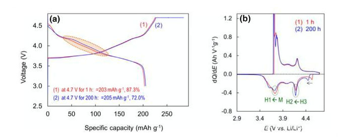 從下圖b中的電壓差分曲線我們可以看到,放電過(guò)程中代表H3-H2和M-H1相轉(zhuǎn)變的特征峰隨著浮充時(shí)間的增加,展現(xiàn)出了完全不同的變化趨勢(shì),這也表明晶格氧的氧化還原對(duì)于材料的容量會(huì)有一定的貢獻(xiàn),而這會(huì)受到浮充時(shí)間的影響。