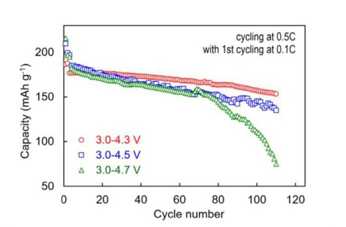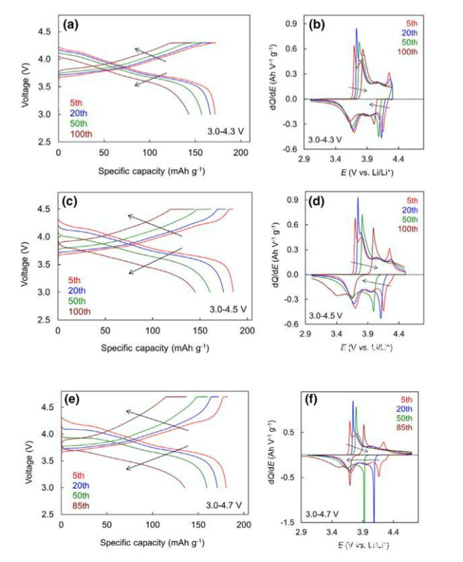 下圖為NCM811材料在不同的工作電壓范圍內(nèi)的循環(huán)性能曲線,從圖中能夠看到提升充電截止電壓并不能顯著的提升材料的容量發(fā)揮,但是卻會(huì)導(dǎo)致材料的循環(huán)性能出現(xiàn)明顯的下降,特別是充電截止電壓為4.7V的電池在循環(huán)70次后就開(kāi)始出現(xiàn)容量跳水的現(xiàn)象。