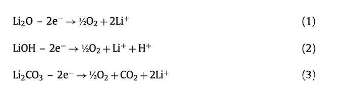 下圖a為L(zhǎng)i/NCM811扣式電池的前三次充放電曲線,從圖中能夠看到第一次充放電曲線與第2、3次充放電曲線有著明顯的區(qū)別,這主要是因此首次充放電過(guò)程中NCM811材料極化比較大,并且?guī)靷愋瘦^低。從下圖b的電壓差分曲線可以看到在首次充電的過(guò)程中在4.33V附近,首次放電在4.53V附近分別出現(xiàn)了一個(gè)較寬的特征峰,由于在該電池中采用的電解液耐氧化電位可達(dá)5V,因此作者認(rèn)為在首次充電過(guò)程中出現(xiàn)的特征峰是由于NCM811材料表面產(chǎn)生的Li2CO3、LiOH和Li2O等雜質(zhì)分解產(chǎn)生的(如下式所示),而放電過(guò)程中產(chǎn)生的特征峰則來(lái)自于NCM811表面化學(xué)吸附O。