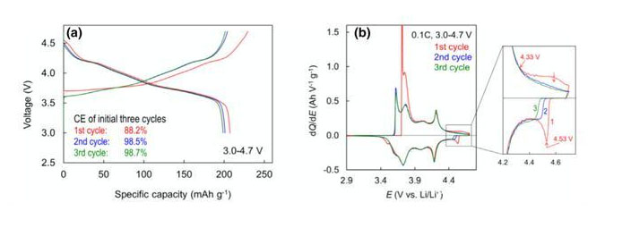 Sheng S. Zhang的研究表明NCM811材料在4.1V附近發(fā)生H2-H3相變的同時(shí)還會(huì)伴隨著的晶格氧的析出,而析出的晶格氧會(huì)氧化電解液,同時(shí)還會(huì)導(dǎo)致材料的從層狀結(jié)構(gòu)向尖晶石結(jié)構(gòu)和巖鹽結(jié)構(gòu)轉(zhuǎn)變,從而導(dǎo)致材料的放電容量和電壓平臺(tái)發(fā)生持續(xù)的衰降,是引起NCM811材料在高電壓下衰降的主要原因。