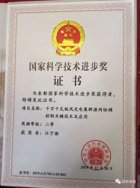 2019年度國(guó)家科學(xué)技術(shù)獎(jiǎng)勵(lì)大會(huì)1月10日在北京舉行,由國(guó)網(wǎng)甘肅省電力公司汪寧渤等人主持完成的“千萬(wàn)千瓦級(jí)風(fēng)光電集群源網(wǎng)協(xié)調(diào)控制關(guān)鍵技術(shù)及應(yīng)用”榮獲國(guó)家科學(xué)技術(shù)進(jìn)步二等獎(jiǎng)。