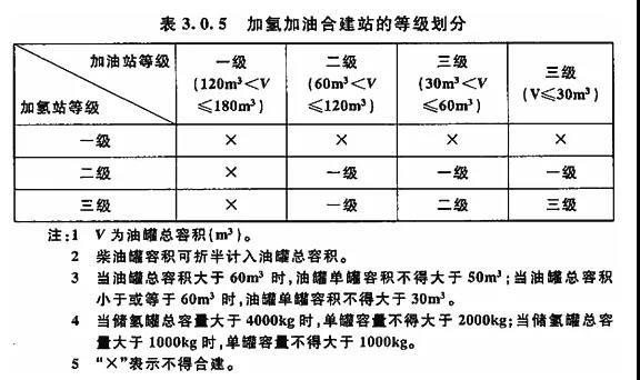 在建站標(biāo)準(zhǔn)方面,目前油氫合建站能夠依據(jù)的僅有2010年制定的《加氫站技術(shù)規(guī)范GB50516-2010》(后有推出《加氫站安全技術(shù)規(guī)范》GB/T34584-2017,但非強(qiáng)制性國(guó)家標(biāo)準(zhǔn)),其中3.0.1規(guī)定,加氫站可與天然氣加氣站或加油站聯(lián)合建站(等級(jí)劃分如下圖);3.0.9規(guī)定,加氫加油合建站、加氫加氣合建站中的加油、加氣設(shè)施的設(shè)計(jì)、施工,應(yīng)符合現(xiàn)行國(guó)家標(biāo)準(zhǔn)《汽車加油加氣站設(shè)計(jì)與施工規(guī)范》GB50156的有關(guān)規(guī)定。