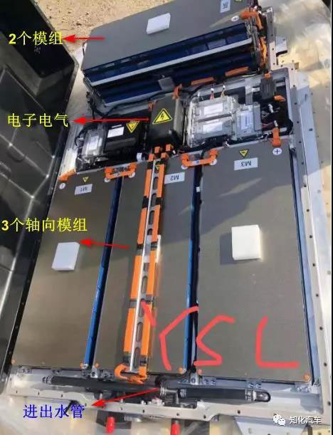 每個模組的上方都有金云母,以防火阻燃,是能看到的明顯安全措施。熱管理方面采用水冷設計,冷板平鋪在電芯底部(通過導熱膠增加導熱率)。