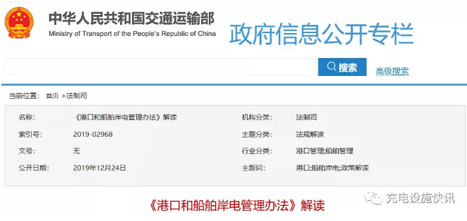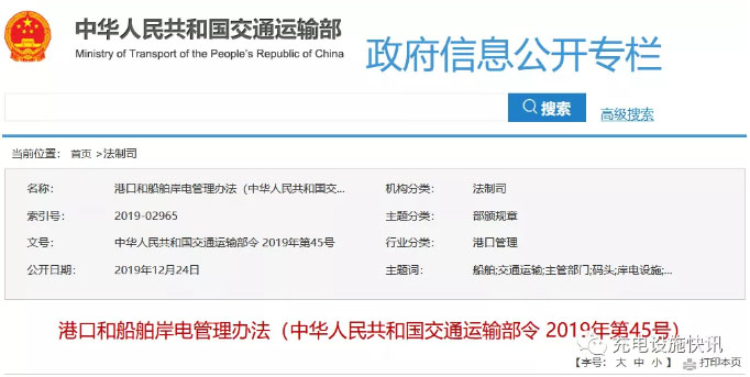 《港口和船舶岸電管理辦法》已于2019年12月4日經第29次部務會議通過,現(xiàn)予公布,自2020年2月1日起施行。