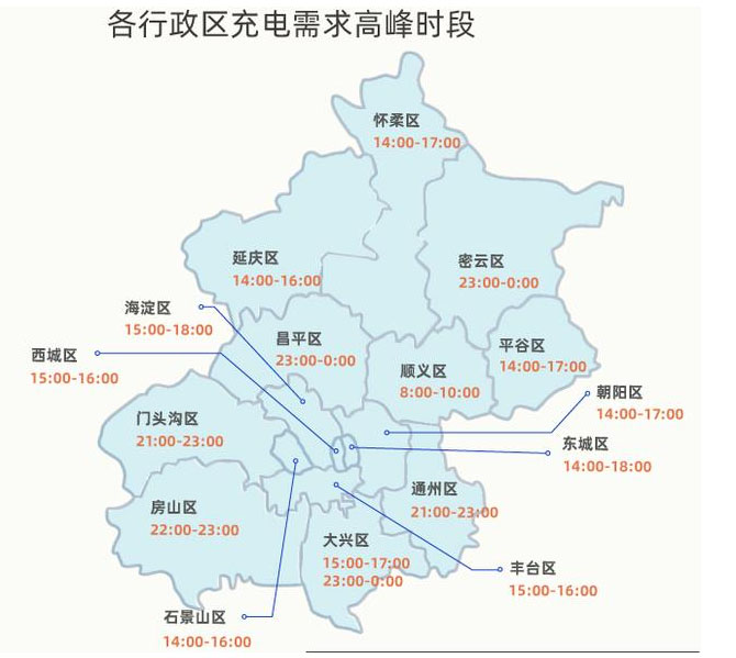 細(xì)分到北京各區(qū),朝陽(yáng)區(qū)、西城區(qū)、東城區(qū)、豐臺(tái)區(qū)、海淀區(qū)等人流密集行政區(qū)的充電高峰時(shí)段主要圍繞在15:00-18:00之間。房山區(qū)、昌平區(qū)、通州區(qū)、門(mén)頭溝區(qū)等行政區(qū)的充電高峰時(shí)段則主要圍繞在21:00-23:00之間。