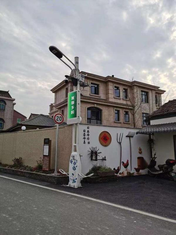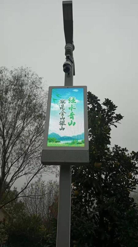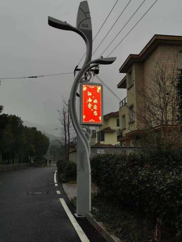 智慧燈桿中間一塊大屏幕上循環(huán)播放著數(shù)字鄉(xiāng)村等圖片,屏幕上方是一個攝像頭與氣象傳感器,最頂部便是一個5G微基站。屏幕底部是一個充電樁。