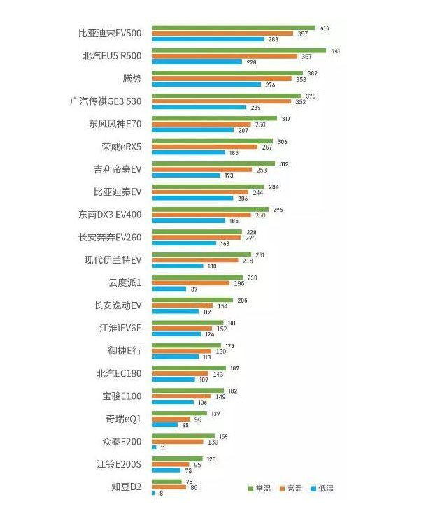 新能源汽車在常溫、高溫、低溫下的各項續(xù)航里程,圖片來源于EV-TEST