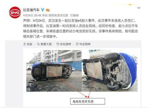 比亞迪官方對e5起火事件做出回應(yīng)(圖片來自微博)