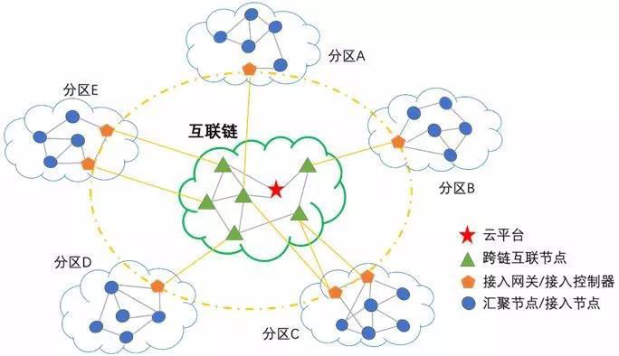 泛在電力物聯(lián)網(wǎng)一個(gè)特性是便于劃分片區(qū)。小到一個(gè)變電站,站內(nèi)安裝的局部放電、氣體組分、溫濕度、視頻、紅外等所有傳感器,依托于匯聚節(jié)點(diǎn)或接入節(jié)點(diǎn)構(gòu)建成一個(gè)小的區(qū)塊鏈。若干變電站間再通過(guò)接入控制器或接入網(wǎng)關(guān)構(gòu)建一個(gè)更大范圍的區(qū)塊鏈。這樣就將原始的區(qū)塊鏈切分為很多分區(qū),交易記錄將在不同分區(qū)并行處理。因此,可將圖1所示架構(gòu)改進(jìn)為圖2所示的分區(qū)并行聯(lián)盟鏈。根據(jù)區(qū)域或業(yè)務(wù)對(duì)電力設(shè)備泛在物聯(lián)網(wǎng)進(jìn)行合理分區(qū)即并行化處理,再通過(guò)跨鏈互聯(lián)節(jié)點(diǎn)在互聯(lián)鏈中與云平臺(tái)節(jié)點(diǎn)進(jìn)行數(shù)據(jù)及服務(wù)交易。片內(nèi)交易時(shí)的共識(shí)機(jī)制采用流水化技術(shù)優(yōu)化效率,并通過(guò)隨機(jī)輪換記賬節(jié)點(diǎn)集合機(jī)制進(jìn)一步提升效率,從而最終構(gòu)建一個(gè)更適用于電力設(shè)備泛在物聯(lián)網(wǎng)的分區(qū)并行高通量聯(lián)盟鏈。