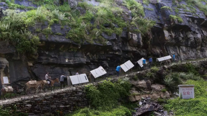 四川省涼山州冕寧縣新興鄉(xiāng),中興能源施工人員跨過(guò)雅礱江,翻越兩座山,沿著懸崖攀爬3個(gè)小時(shí),動(dòng)用騾馬等工具搬運(yùn)光伏設(shè)備,最終到達(dá)電站施工所在的偏遠(yuǎn)村莊。