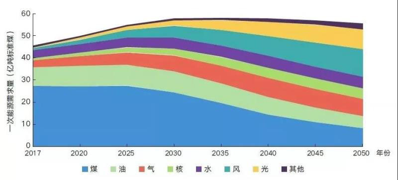 相比之下,化石能源需求量已進(jìn)入平臺(tái)期,2025年后將快速下降。化石能源需求量在2025年前后達(dá)到峰值,峰值為43億噸標(biāo)準(zhǔn)煤。煤炭需求量仍處于峰值平臺(tái)期,占一次能源需求的比重持續(xù)下降。2020-2025年煤炭需求量約為27億~28億噸標(biāo)準(zhǔn)煤,占一次能源需求的比重在2025年降至50%,比2017年下降近10個(gè)百分點(diǎn);2025年后加速下降,2035年降至34%~36%,2050年降至15%~19%。