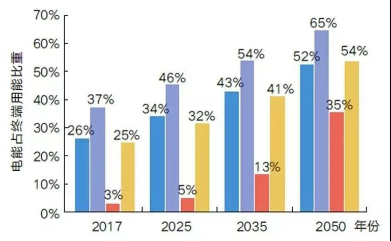 工業(yè)部門是傳統(tǒng)用電大戶,電能占比將從2017年26%逐步提高到2035年43%,2050年繼續(xù)攀升至52%。
