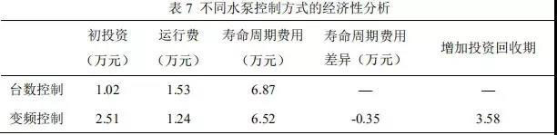 對(duì)兩種運(yùn)行方案的二次泵初投資及生命周期運(yùn)行費(fèi)進(jìn)行計(jì)算,見(jiàn)表7。因?yàn)槌跬顿Y的增加,變頻的壽命周期費(fèi)用僅略小,對(duì)數(shù)據(jù)中心而言,從經(jīng)濟(jì)性角度看,定壓變頻控制的優(yōu)勢(shì)并沒(méi)有那么明顯。