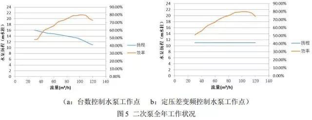 由圖5(a)可知,二次泵以臺(tái)數(shù)控制的方式運(yùn)行,水泵的工作點(diǎn)揚(yáng)程大部分時(shí)刻高于11m。由圖5(b)可知,二次泵以變頻控制的方式運(yùn)行,水泵的工作點(diǎn)揚(yáng)程維持在11m。對(duì)兩種控制方式的水泵運(yùn)行電耗進(jìn)行模擬可得,臺(tái)數(shù)控制與定壓差變頻控制下的水泵電耗分別為7895kWh、6524kWh,采用定壓差變頻控制方式可節(jié)省電耗16%。