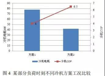 圖4所示為某一時(shí)刻,不同冷機(jī)方案下對(duì)應(yīng)的冷機(jī)電耗及COP。對(duì)冷機(jī)全年運(yùn)行電耗進(jìn)行模擬分析,方案1和方案2的全年運(yùn)行能耗分別為19165kWh和1589 kWh,方案2的冷機(jī)搭配方案下的冷機(jī)全年運(yùn)行電耗與方案1相比有明顯降低,降低了17%的運(yùn)行電耗。