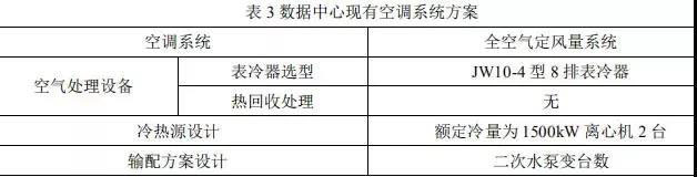 根據(jù)上述調(diào)研結(jié)果,以北京市某數(shù)據(jù)中心為對(duì)象,對(duì)其進(jìn)行DeST能耗模擬及節(jié)能優(yōu)化。該建筑主要功能房間現(xiàn)有的空調(diào)系統(tǒng)設(shè)計(jì)、空氣處理設(shè)備以及冷熱源設(shè)計(jì)如表3所示。