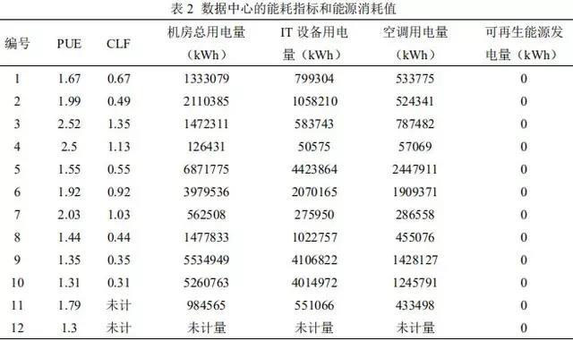 根據(jù)上述方法,得到各數(shù)據(jù)中心的總用電量、IT設(shè)備用電量、空調(diào)用電量、可再生能源發(fā)電量等能耗指標(biāo),整理后得到各數(shù)據(jù)中心的PUE和CLF值。具體信息如表2所示。