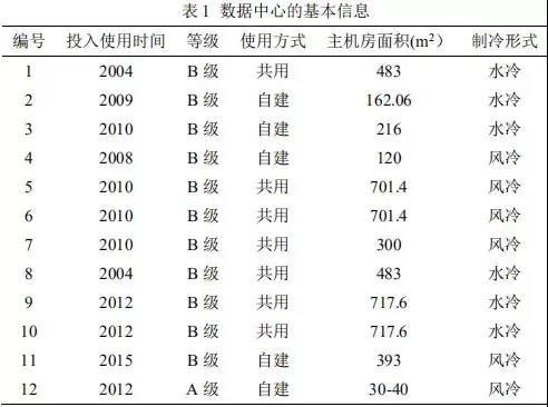 本次調(diào)研對(duì)象為北京市12處數(shù)據(jù)中心,其基本信息見(jiàn)表1。本次調(diào)研對(duì)象從投入使用時(shí)間、規(guī)模以及制冷形式來(lái)看,基本涵蓋了北京市所有數(shù)據(jù)中心的類(lèi)型,選取的數(shù)據(jù)中心樣本具有一定的代表性。調(diào)研內(nèi)容包括數(shù)據(jù)中心基本信息、能源評(píng)價(jià)信息、能耗指標(biāo)信息、能源管理系統(tǒng)信息。