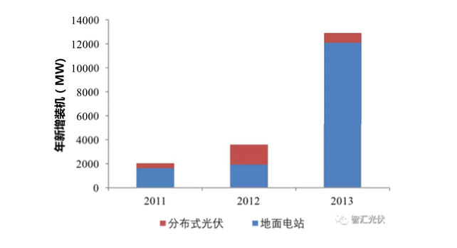明確的電價政策,讓業(yè)主有了明確的收益預(yù)期,大大激發(fā)了企業(yè)的投資積極性。2011當(dāng)年,新增裝機就達到2GW,同比增長300%,中國的光伏電站正式進入GW級時代。2013年,年新增裝機甚至達到了近13GW。