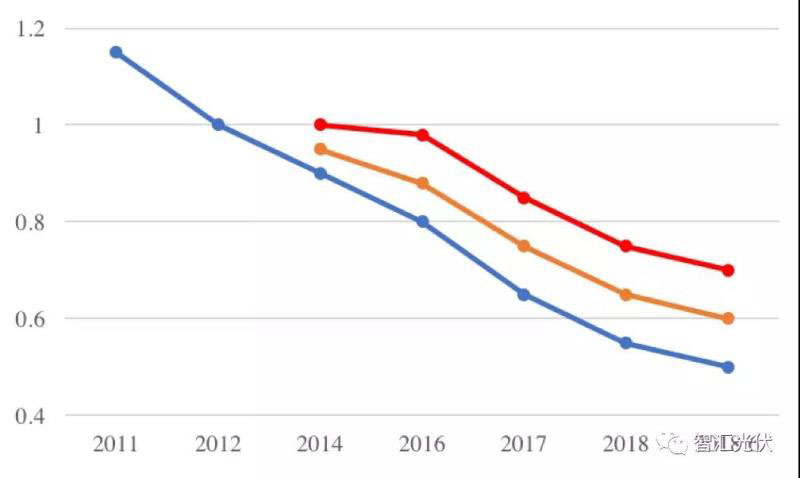 2014年~2018年,光伏系統(tǒng)造價仍然持續(xù)降低,但下降速度明顯低于2008~2013年,具體如下圖所示。