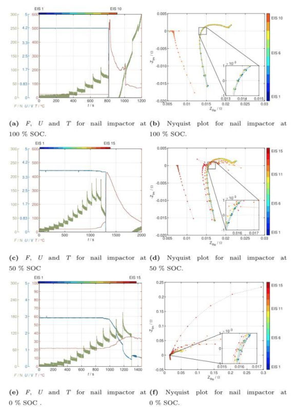 下圖e為0%SoC狀態(tài)下的針刺實(shí)驗(yàn)曲線,從圖中能夠看到在針刺實(shí)驗(yàn)進(jìn)行到第10步時(shí),電池開始出現(xiàn)電壓降低和溫度升高,在隨后的實(shí)驗(yàn)步驟中盡管電池的電壓顯著降低,但是由于電池內(nèi)部的電量較少,電池的最高溫升僅為36℃。從下圖f中的阻抗測試結(jié)果可以看到,在短路發(fā)生前,EIS曲線幾乎沒有發(fā)生變化,在短路發(fā)生后電池的歐姆阻抗出現(xiàn)了輕微的降低,