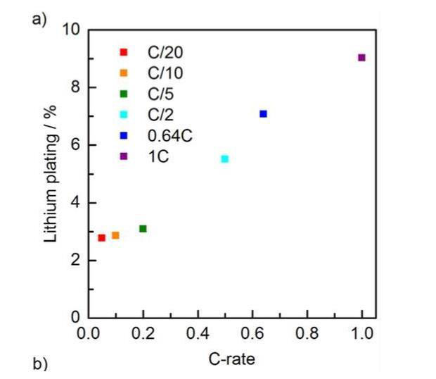 不同的倍率下導(dǎo)致的析鋰的量如下圖所示,從圖上可以看到,隨著充電倍率的增大電池的析鋰數(shù)量逐漸增加,特別是倍率超過(guò)C/2后,電池的析鋰量出現(xiàn)了明顯的增加,不過(guò)需要注意的是即使在C/20的小倍率下仍然出現(xiàn)了3%左右的析鋰量。