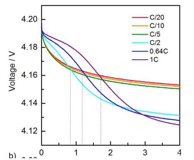 除了中子衍射,Christian von Luders還測(cè)試了電池靜置過(guò)程中電池電壓曲線,如下圖所示,從圖上可以看到,充電倍率再C/2以上的電池,在電壓靜置過(guò)程中都出現(xiàn)了一個(gè)電壓平臺(tái),對(duì)于C/2充電的電池,這個(gè)電壓平臺(tái)的時(shí)間長(zhǎng)度為2h,對(duì)于1C充電的電池,這個(gè)電壓平臺(tái)的長(zhǎng)度時(shí)3h。根據(jù)中子衍射的數(shù)據(jù)可以得知,該電壓平臺(tái)主要對(duì)應(yīng)的是析出的鋰重新嵌入到石墨晶體結(jié)構(gòu)中的過(guò)程。
