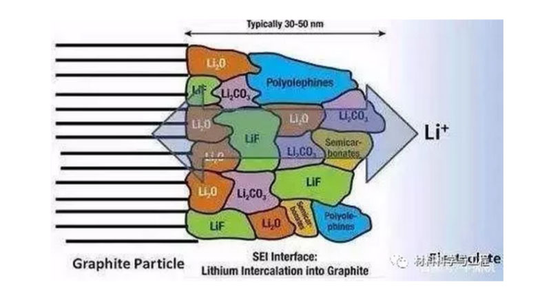 在液態(tài)鋰離子電池首次充放電過程中,電極材料與電解液在固液相界面上發(fā)生反應(yīng),形成一層覆蓋于電極材料表面的鈍化層。這種鈍化層是一種界面層,具有固體電解質(zhì)的特征,是電子絕緣體卻是Li+ 的優(yōu)良導(dǎo)體,Li+ 可以經(jīng)過該鈍化層自由地嵌入和脫出,因此這層鈍化膜被稱為“固體電解質(zhì)界面膜”( solid electrolyte interface) ,簡稱SEI 膜。