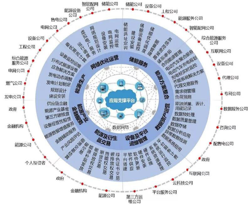 ● 按照能源產(chǎn)業(yè)鏈的發(fā)展動(dòng)向來劃分,能源生態(tài)圈的參與主體分為八大部分,即能源生產(chǎn)、網(wǎng)絡(luò)優(yōu)化運(yùn)營、儲(chǔ)能服務(wù)、能源方案整合、數(shù)據(jù)資產(chǎn)運(yùn)營、平臺(tái)運(yùn)維管理、能源及衍生品交易和能源產(chǎn)業(yè)金融服務(wù)。