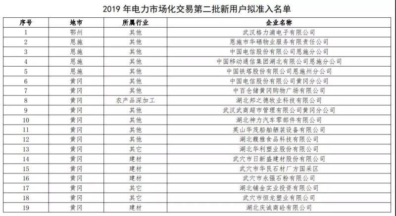 中國儲能網(wǎng)訊:日前,湖北省能源局印發(fā)《關于湖北省2019年電力市場化交易第二批新用戶擬準入名單的公示》 。公示稱,根據(jù)《省能源局關于印發(fā)2019年湖北省電力市場化交易實施方案的通知》(鄂能源建設〔2019〕18號)相關規(guī)定,各市州電力行政主管部門會同市州其他相關部門、供電公司按照電力用戶準入條件有關要求已完成用戶準入審查,并報湖北電力交易中心匯總,我局現(xiàn)將通過審查的96家第二批新用戶名單予以公示(第二批新用戶具體名單詳見附件)。公示期為7天,公示期間如有問題請及時反饋。